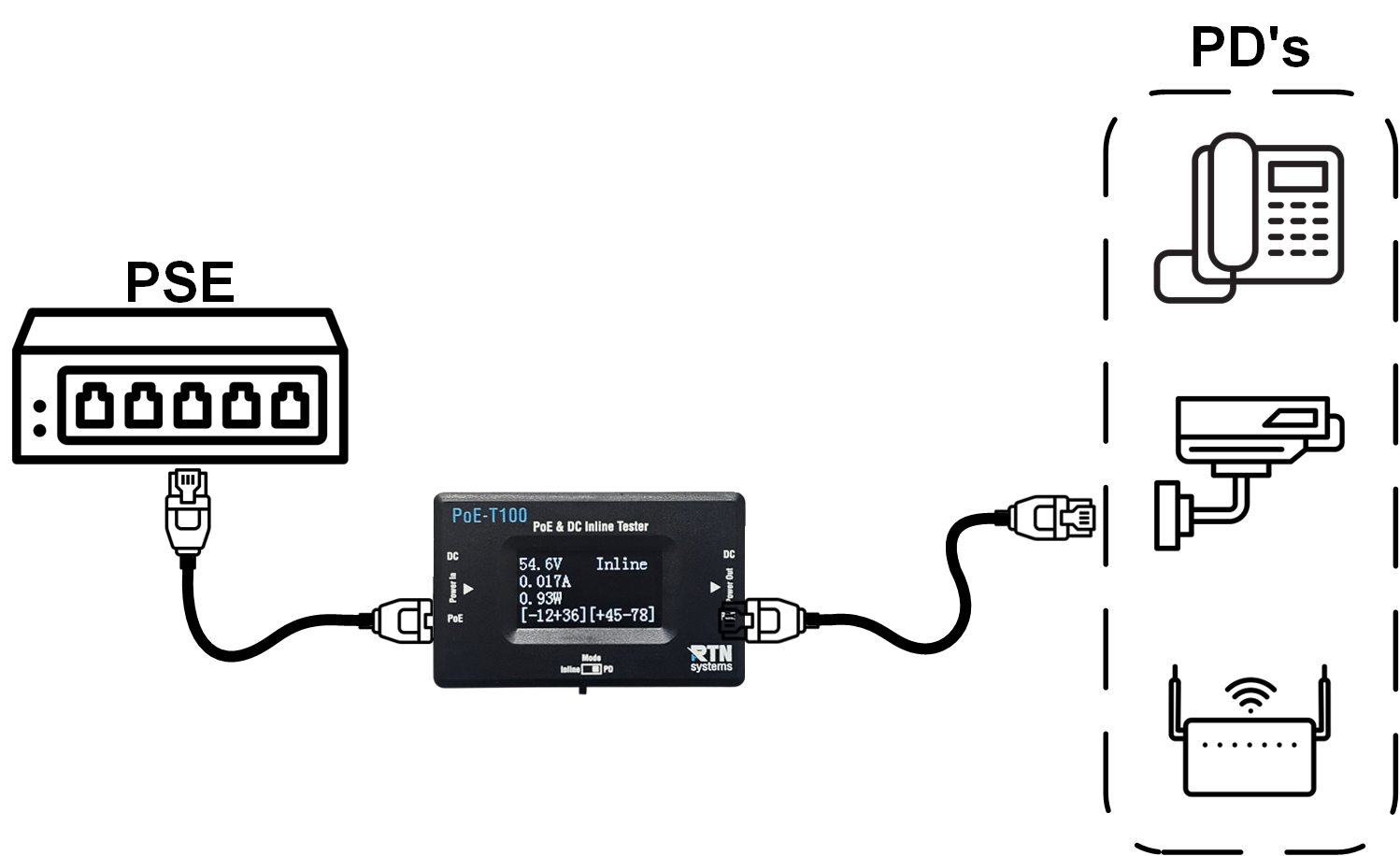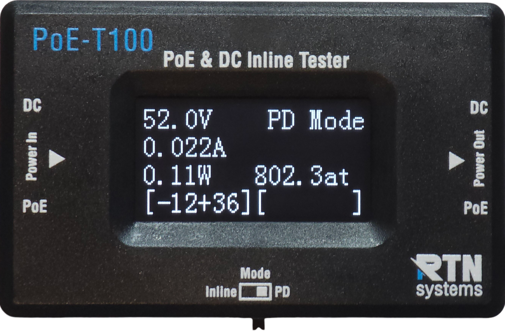 • Inline & PD Testing: This network tester supports two modes; PD Mode (simulates a powered device up to 802.3bt), Inline Mode (pass-through testing between PSE & PD), and DC Mode (measures DC supply voltage, current, and polarity for non-PoE power sources).
